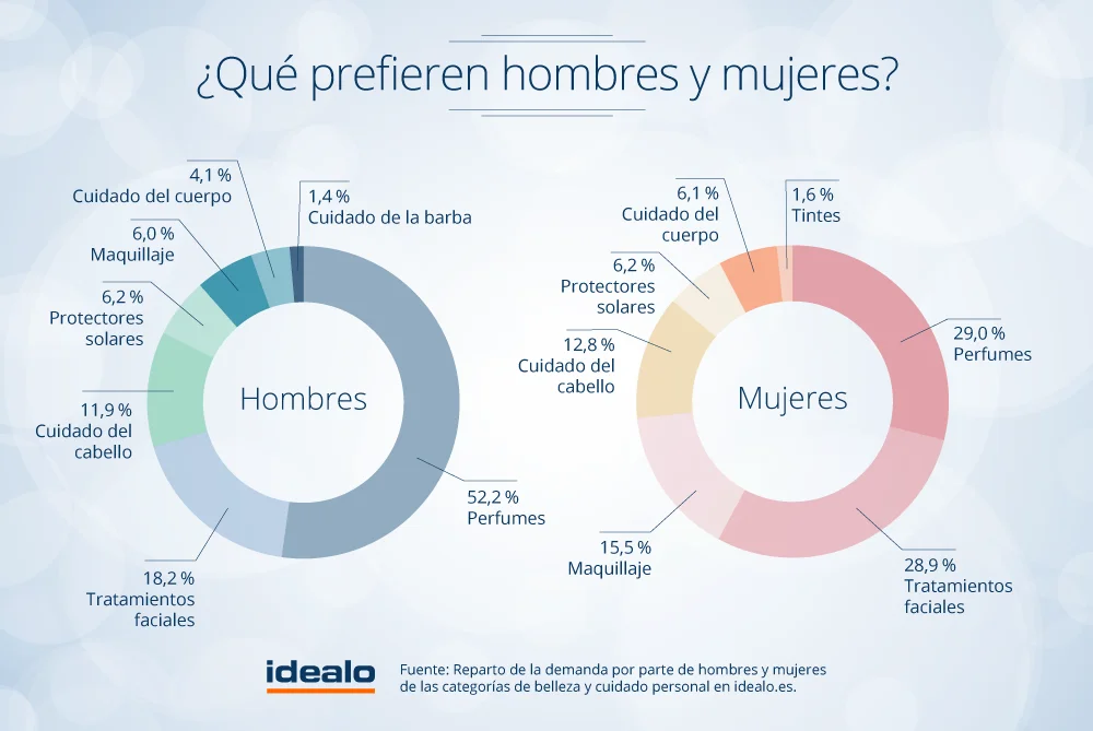 De acuerdo con una reciente encuesta llevada a cabo por Ipsos Global Advisor, los productos de cosmética y belleza son de los más demandados online en España, centrando hasta un 19 % de las compras online. Pero, ¿es verdad aquello que dicen que los hombres son de marte y las mujeres de venus? ¿Hay grandes diferencias entre hombres y mujeres cuando se trata de productos de belleza? Para responder a esta pregunta, desde idealo analizamos cómo se reparte la demanda de productos de belleza y cuidado personal por parte de los hombres y de las mujeres, respectivamente.